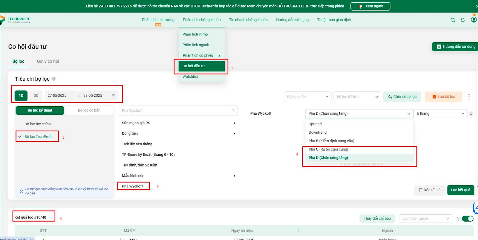 LƯU Ý: Không phải cổ phiếu cứ vào phase C, phase D là chắc chắn sẽ tăng mà sẽ phụ thuộc vào diễn biến sau đó. Tuy nhiên bộ lọc này sẽ giúp nhà đầu tư rút ngắn thời gian tìm ra những cổ phiếu tiềm năng đang tạo mẫu hình đẹp.
